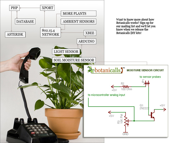 Each plant on the Botanicalls system is equipped with sensors connected to an Arduino microcontroller which contains code particular to that plant type. When a plant’s microcontroller determines that the plant needs to make a phone call based on current sensor information, it sends data through an Xbee wireless radio to an Xport gateway. This gateway connects to the internet, where it contacts a PHP script with the plant’s ID number and type of need. PHP then packages this information and passes it on to Asterisk, an open-source telephone system, which generates the call. When the call is placed, a prerecorded audio file is played, expressing the particular desire of that plant.