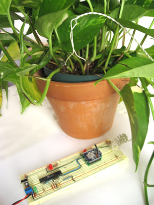 The moisture sensor circuit is based on Forrest Mims. Read more on Rob Faludi’s blog.