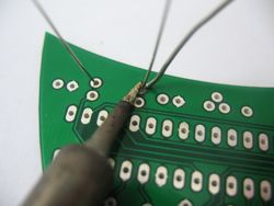 Place the tip of your soldering iron at the joint where the resistor leg and the edge of the hole meet. Press the solder into this junction so it melts and flows freely. Once the junction is covered, remove the iron and solder.