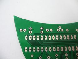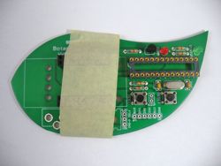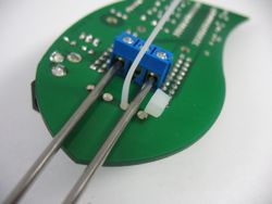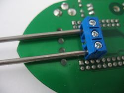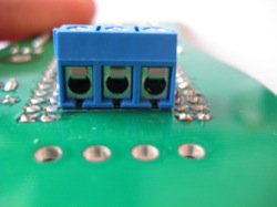 Tape in place. Turn the board so you are once again looking at the front. Solder the leads of the terminal block. Remove the tape.