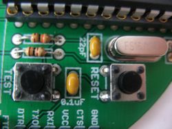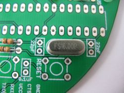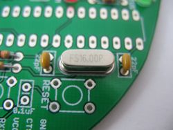 Insert the crystal. There’s no polarity here so it can go in either way. Solder in place and snip the leads.
