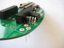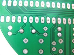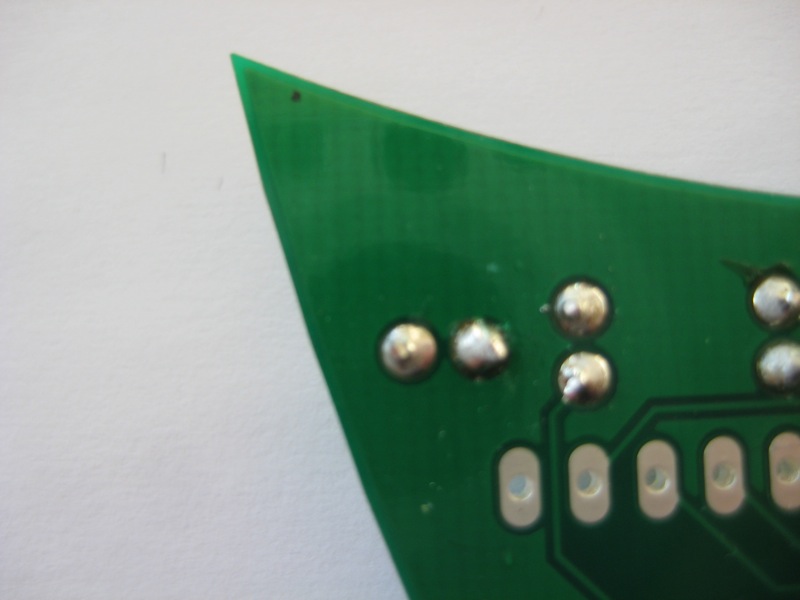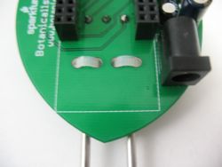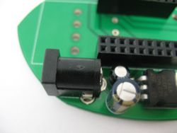 Insert the power jack so the opening is facing the edge of the board. Carefully but firmly press the jack so it snaps into place. Turn the board over and solder. Use enough solder so that the holes are completely filled. This will add physical strength to the connector.