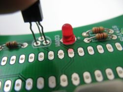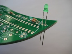 Take the green LED and insert it into the “Status” light location. Make sure that you put the longer positive leg into the hole marked “+” and the shorter negative leg into the unmarked hole. Once the LED is inserted, flip the board. You can spread the legs on the LED, just as you did with resistors, to hold it in place.