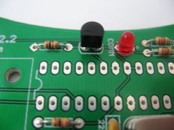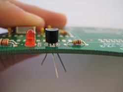 The transistor will sit approximately 1/4″ above the board (see photo above). Solder in place and snip the leads.