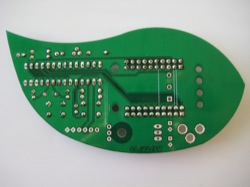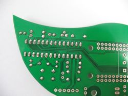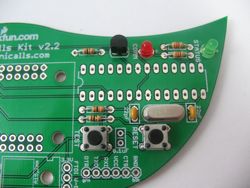 Find marking for the 220 resistor on the leaf. Slide the legs through the holes. Once the resistor is place, you can bend the legs out slightly to hold it in place when you turn the board upside down.