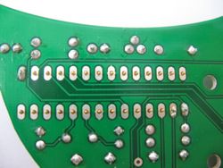Flip the board. At first, solder only the two pins on opposing corners to secure the socket in place.