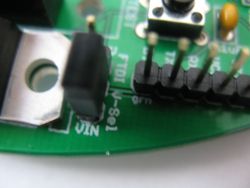 Slide the black jumper onto the three pin header as shown, connecting the VIN and center pins together. This is the position for using an FTDI programming cable that supplies 5V DC power to the board.