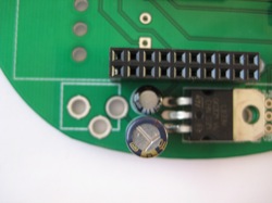 Insert the regulator in its three pin holes. Slide it so the large hole in the top of the regulator lines up with the matching large hole in the board.