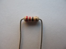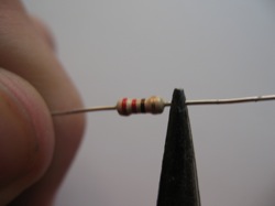 First we’ll start with the resistors. Take the 220 ohm resistor – it’s identified by the color bands “red, red, brown, gold”. Take your needle nose pliers and bend the legs of the resistor 90 degrees each so they’re pointed in the same direction.