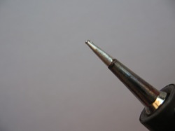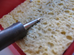Once your iron is heated up, tin the tip by pressing solder into the tip, then wipe away the excess on a damp sponge. Here’s an excellent video tutorial on soldering we found online.