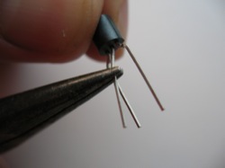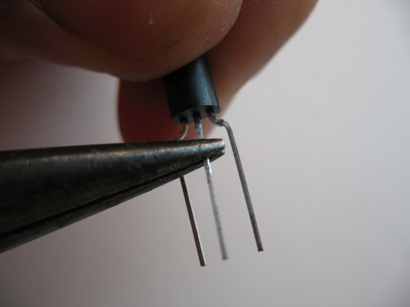 Take the transistor. Gently bend the center lead out toward the rounded side.