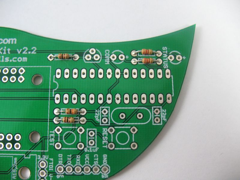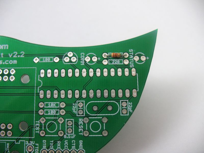 Find marking for the 220 resistor on the leaf. Slide the legs through the holes. Once the resistor is place, you can bend the legs out slightly to hold it in place when you turn the board upside down.