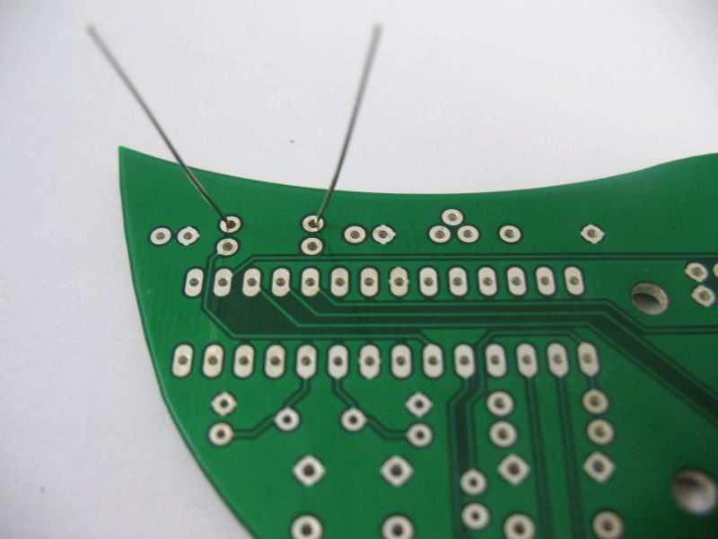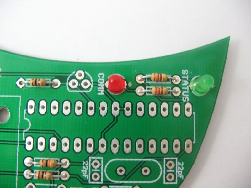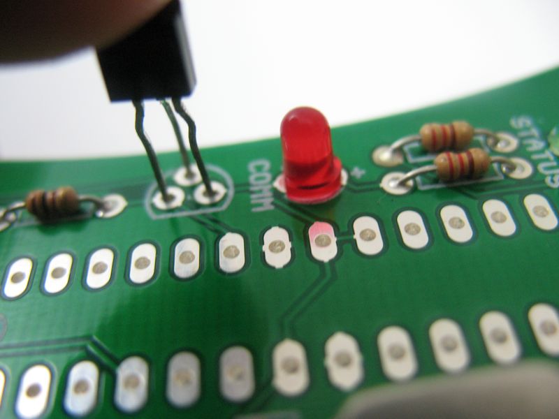 Place the other LED in the “comm” slot the same way, longer leg into the + hole, shorter leg into the unmarked hole, then solder and snip.
