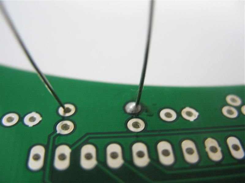 Place the tip of your soldering iron at the joint where the resistor leg and the edge of the hole meet. Press the solder into this junction so it melts and flows freely. Once the junction is covered, remove the iron and solder.