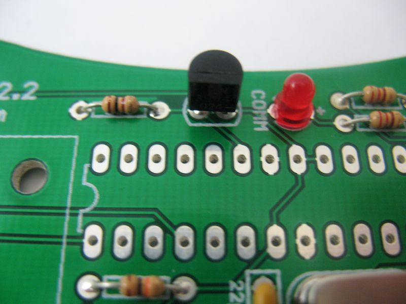 The transistor will sit approximately 1/4″ above the board (see photo above). Solder in place and snip the leads.