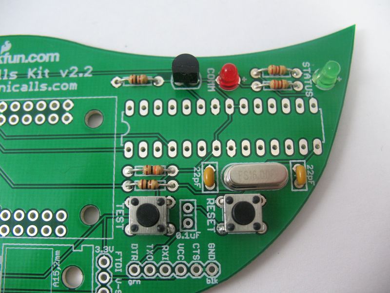 These smaller capacitors are not polarized, so they can be inserted in either direction. Select the 22pF capacitors. They are labeled with “220.” Insert both of these capacitors, solder in place, and snip the excess leads.