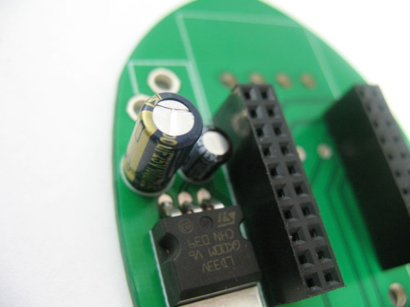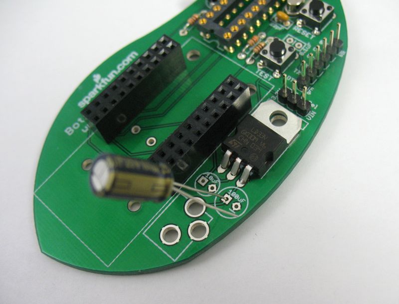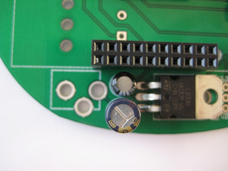 Insert the regulator in its three pin holes. Slide it so the large hole in the top of the regulator lines up with the matching large hole in the board.