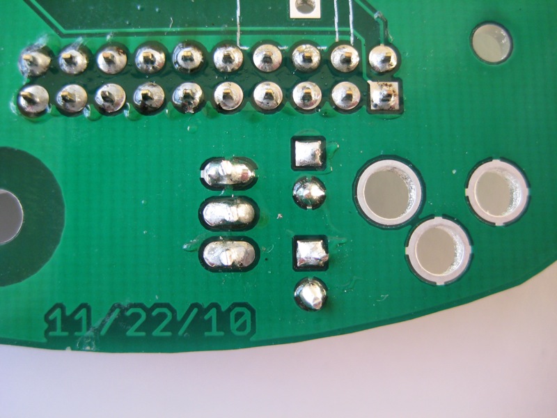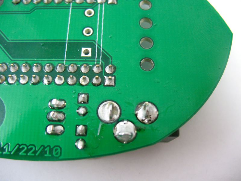 Insert the power jack so the opening is facing the edge of the board. Carefully but firmly press the jack so it snaps into place. Turn the board over and solder. Use enough solder so that the holes are completely filled. This will add physical strength to the connector.