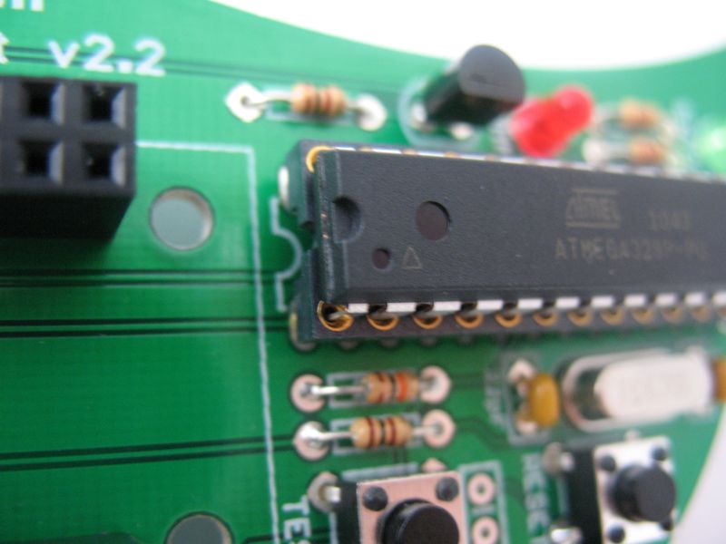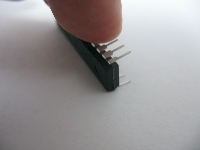 You are now ready to insert the microcontroller into its socket. If its legs are spread too far apart for them to fit into the socket, use a flat surface to help bend them to a 90º angle.