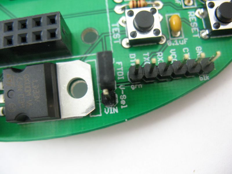 (If you will be using a Sparkfun FTDI Basic Breakout that supplies 3.3V DC, the connector can be repositioned so that it connects the 3.3V and center pins together as shown below.)