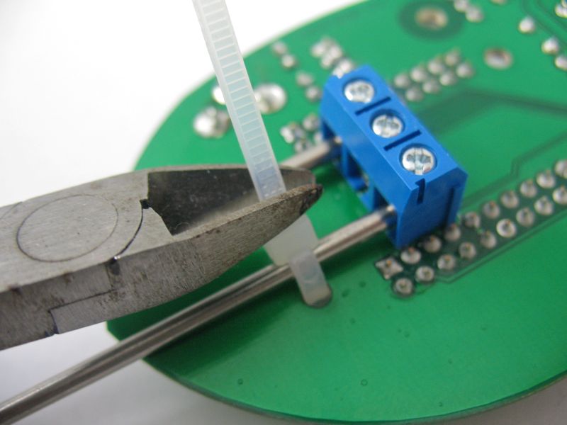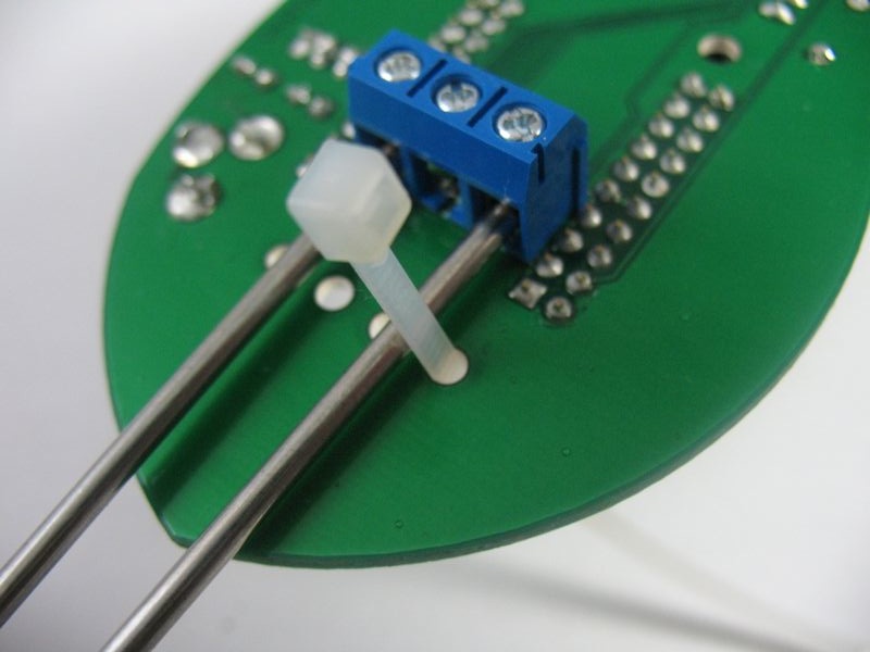 To secure the probes in place, insert the two cable ties through the holes so they loop around the probes as pictured.