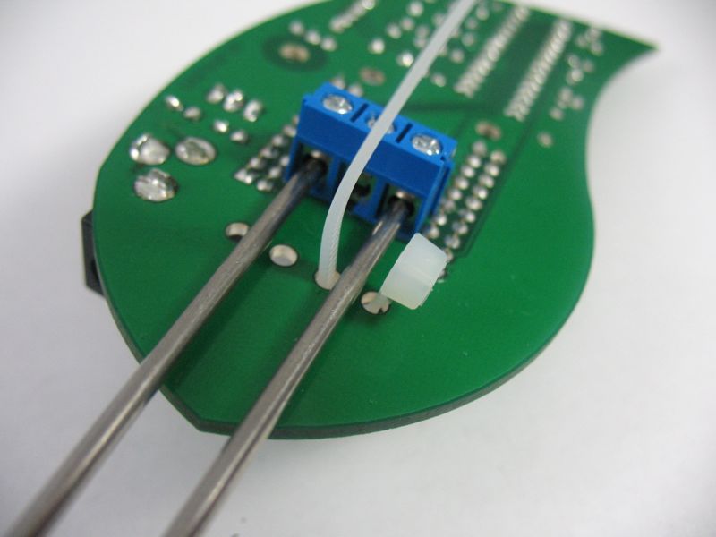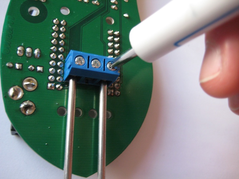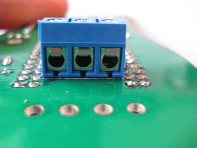 Tape in place. Turn the board so you are once again looking at the front. Solder the leads of the terminal block. Remove the tape.