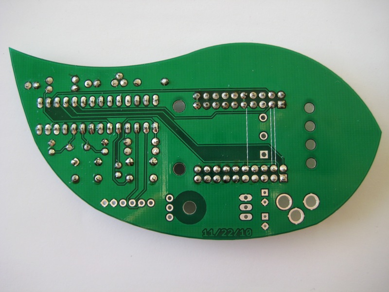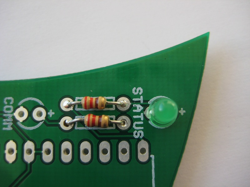 Take the green LED and insert it into the “Status” light location. Make sure that you put the longer positive leg into the hole marked “+” and the shorter negative leg into the unmarked hole. Once the LED is inserted, flip the board. You can spread the legs on the LED, just as you did with resistors, to hold it in place.