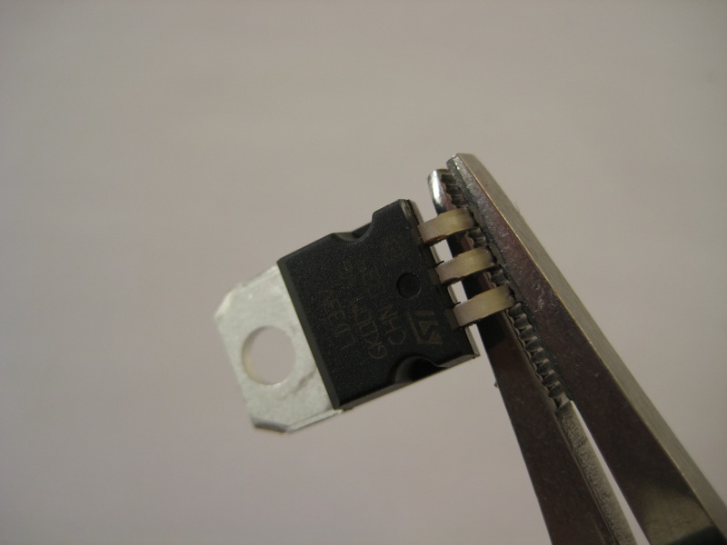 Bend the leads of the voltage regulator as shown. It will lie flat against the board
